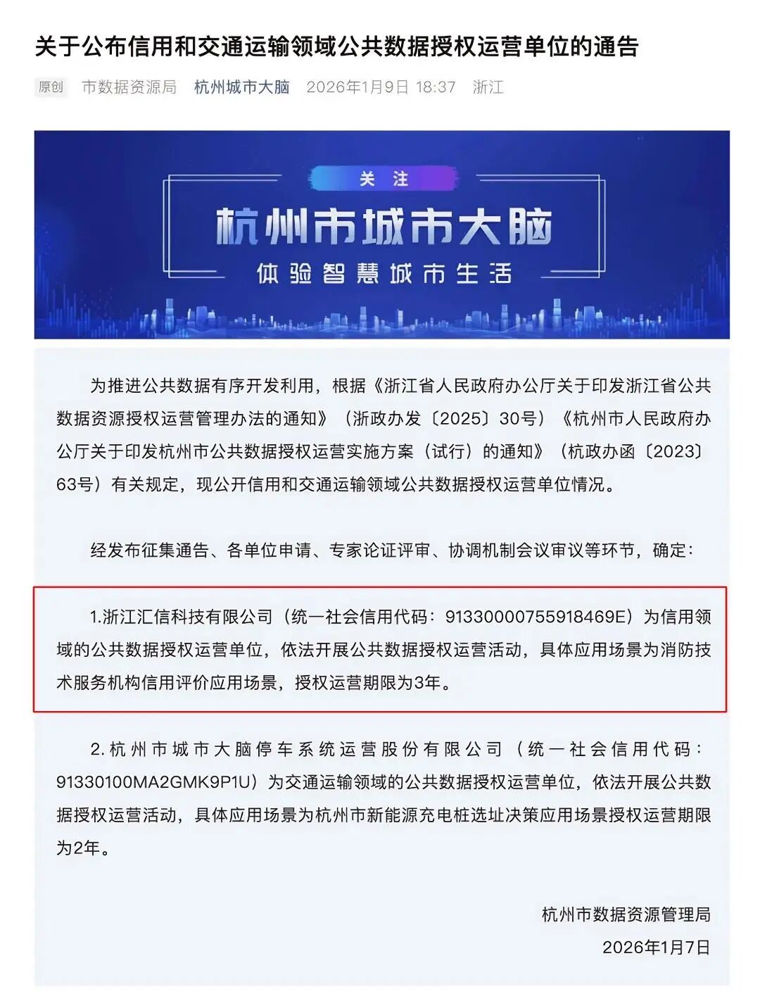 2026年1月7日,杭州市数据资源管理局正式发布《关于公布信用和交通运输领域公共数据授权运营单位的通告》。