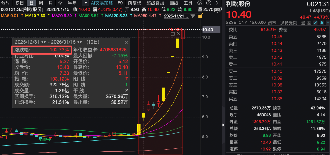 近期AI应用板块持续爆发,利欧股份成为本轮行情中资金追捧的“香饽饽”。截至1月15日收盘,利欧股份报收于10.4元/股。2025年12月31日至2026年1月15日,利欧股份股价累计上涨102.73%。