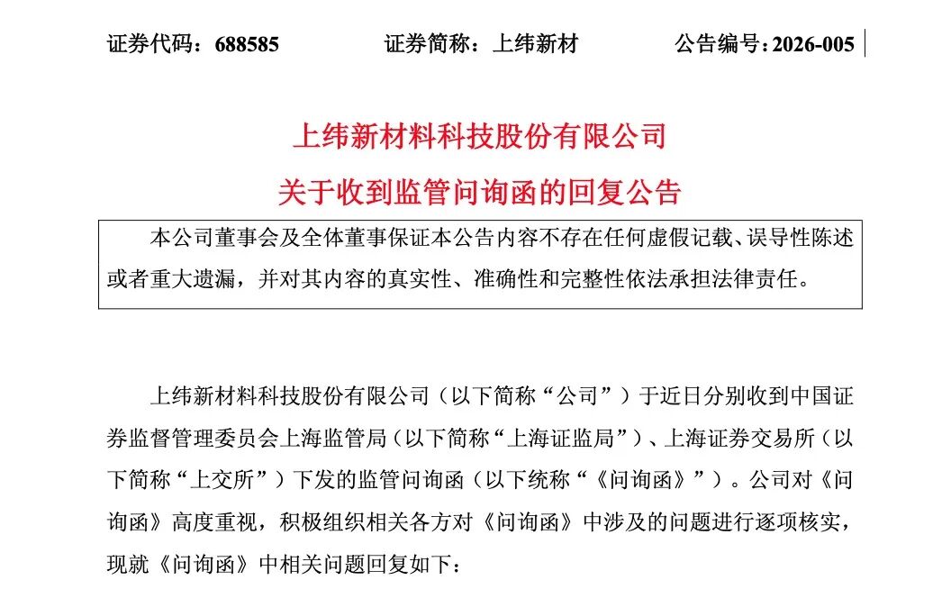 1月16日晚,上纬新材(688585)公告显示,公司于近日分别收到上海证监局、上交所下发的监管问询函。问询函中,监管对其进军个人机器人业务的边界、风险,进行追问。