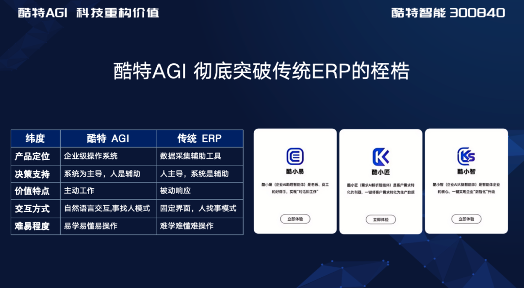基于AGI的“效果涌现”,酷特AGI正帮助企业在各个环节实现“对话即工作”。2025 年6月,在华为开发者大会上,酷特智能重磅发布与华为共同研发的“酷小智”“酷小匠”“酷小易”三款数智化企业级通用智能体应用,彻底打通了数智化转型的 “最后一公里”。其中,“酷小匠” 作为“需求侧-AI 设计师”:核心价值是打通客户定制需求与生产环节的信息壁垒,实现从客户创意到车间生产的数据自动流转,无需人工转译。例如客户仅通过图片、语音或文字表达“想要这样的衣服 ”,它便能秒级解析需求,自动生成版型、工艺单、物料清单,真正实现所见即所得,需求一键直达生产端;“酷小易”作为“运营侧-AI 运营助手”:核心作用是将AI 生成的策略实时转化为具体任务,全程监控各环节进度并向管理者实时汇报,保障任务高效推进。主打“对话即工作 ”模式,可秒回数据、定位问题、推荐方案,还能自动派发任务、跟进进度、组织会议,推动管理从“人找数”转变为“数助人”,让复杂管理变得简单高效;“酷小智”作为“治理侧-AI 组织架构师”,依据任务执行结果动态评估并优化企业制度与流程,构建“战略—计划—执行—反馈”的高速闭环,助力企业实现敏捷试错、持续迭代。支持自然语言开发与零代码应用生成,让业务人员可直接参与创新实践。系统随使用持续进化,组织随迭代愈发敏捷,成功将厚重的IT“巨石”拆解为灵活可拼装的智能“积木”。三款智能体应用的落地,标志着酷特智能的 AGI 技术从理论研究走向了规模化产业应用。