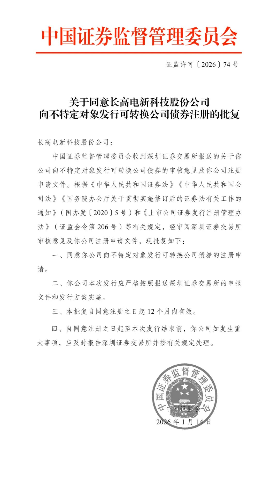1 月16日,长高电新(002452)收到中国证监会出具的《关于同意长高电新科技股份公司向不特定对象发行可转换公司债券注册的批复》,这标志着公司筹备已久的7.58亿元融资计划取得关键性突破,为公司高质量发展注入了强劲的资本动能,更奏响了"十五五"开局之年乘势而上的奋进序曲。