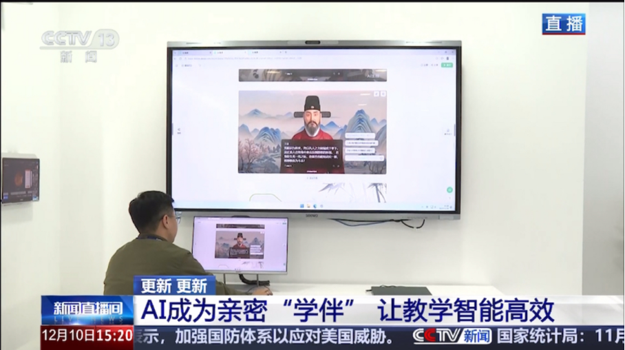 2025年12月10日,央视新闻“安徽人工智能赋能千行百业”主题直播镜头走进视源股份(002841)合肥产业园。中央广播电视总台王利的实时连线,向全国观众生动呈现了人工智能如何从技术走向场景,生动展示了AI如何从“实验室”走入“课堂”,真正成为教师的教学助手与学生的学习伙伴。