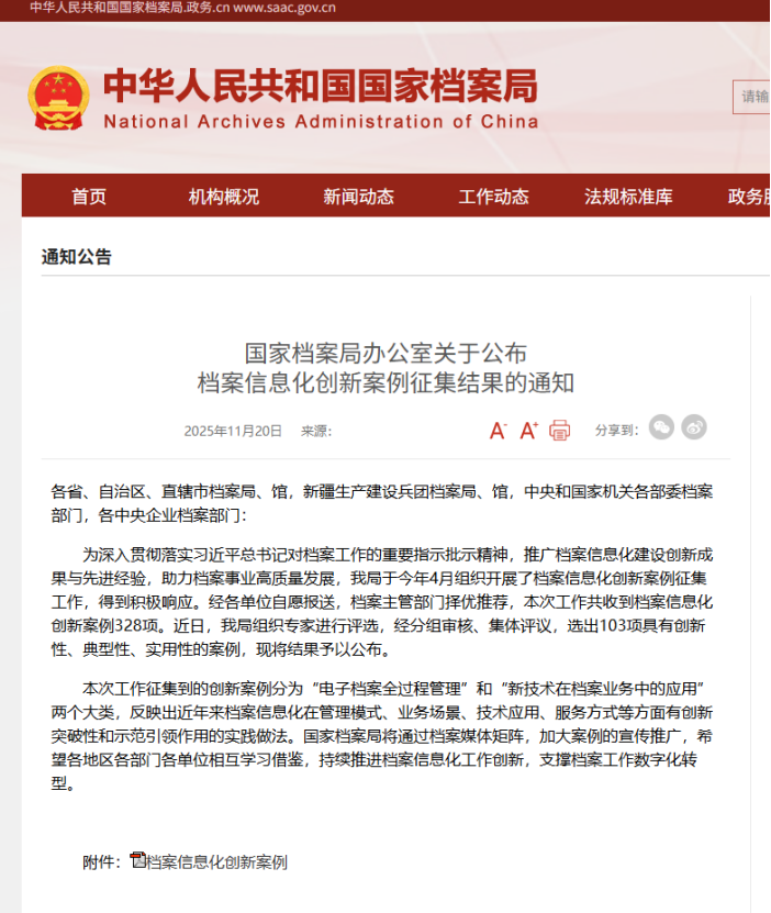 本次创新案例征集分为“电子档案全过程管理”和“新技术在档案业务中的应用”两个大类,专家围绕政策实践、业务创新、技术应用、推广价值等方面开展严格评审,在全国328项申报案例中,103项具有“创新性、典型性、实用性”的优秀案例脱颖而出,获评档案信息化创新案例。