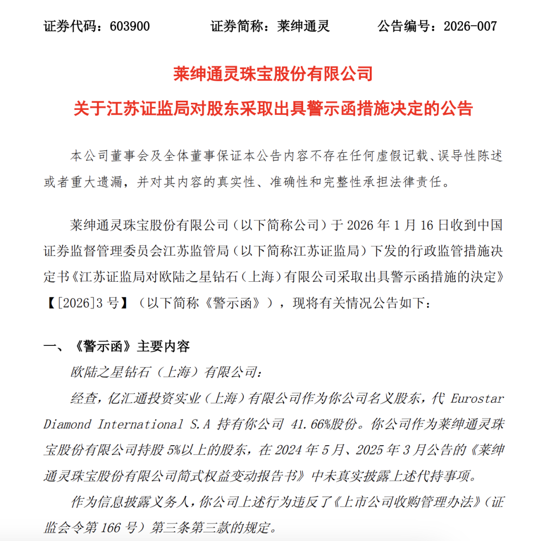 1月16日晚,莱绅通灵(603900)发布公告称,公司当日收到《江苏证监局对欧陆之星钻石(上海)有限公司采取出具警示函措施的决定》(简称“《警示函》”),欧陆之星钻石(上海)有限公司(简称“欧陆之星”)因未如实披露相关股东代持事项,违反了《上市公司收购管理办法》相关规定。