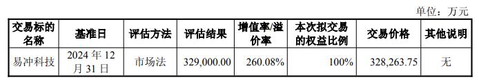 根据金证评估出具的《评估报告》(金证评报字[2025]第0143号),截至评估基准日2024年12月31日,经市场法评估标的公司股东全部权益评估值为329,000.00万元,经资产基础法评估标的公司股东全部权益评估值为285,243.11万元,本次评估结论采用市场法评估结果,评估增值率为260.08%。基于上述评估结果,经上市公司与交易对方友好协商,确定标的公司股东全部权益的交易对价为328,263.75万元。