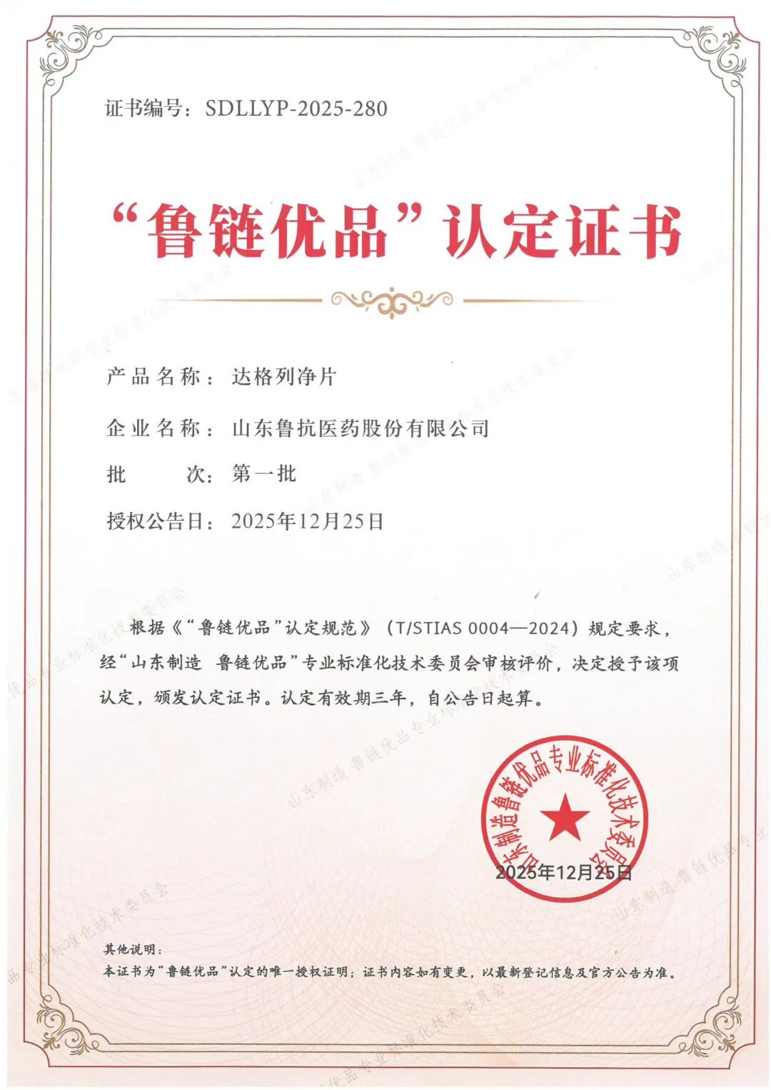为进一步助力重点产业链企业做强国内国际市场,提升我省制造业品牌影响力,推动工业经济高质量发展,省工业和信息化厅联合山东普惠中小企业公共服务中心组织开展了2025年“山东制造 鲁链优品”评价工作。鲁抗医药(600789)达格列净片、头孢拉定胶囊入选“山东制造 鲁链优品”名单(第一批)。