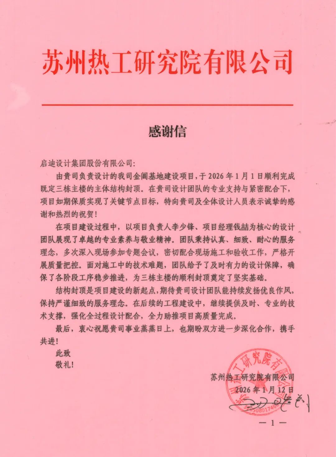 从项目蓝图勾勒到主体结构落成,启迪设计团队始终与业主方紧密协作,以高标准、高质量的设计成果回应了国家重点项目的要求。这封感谢信,承载着过往的并肩努力,也寄托着对携手完成后续建设总目标的共同期许。