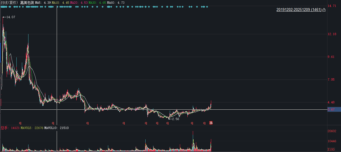 嘉美包装上市至今的股价走势,来源:同花顺iFinD