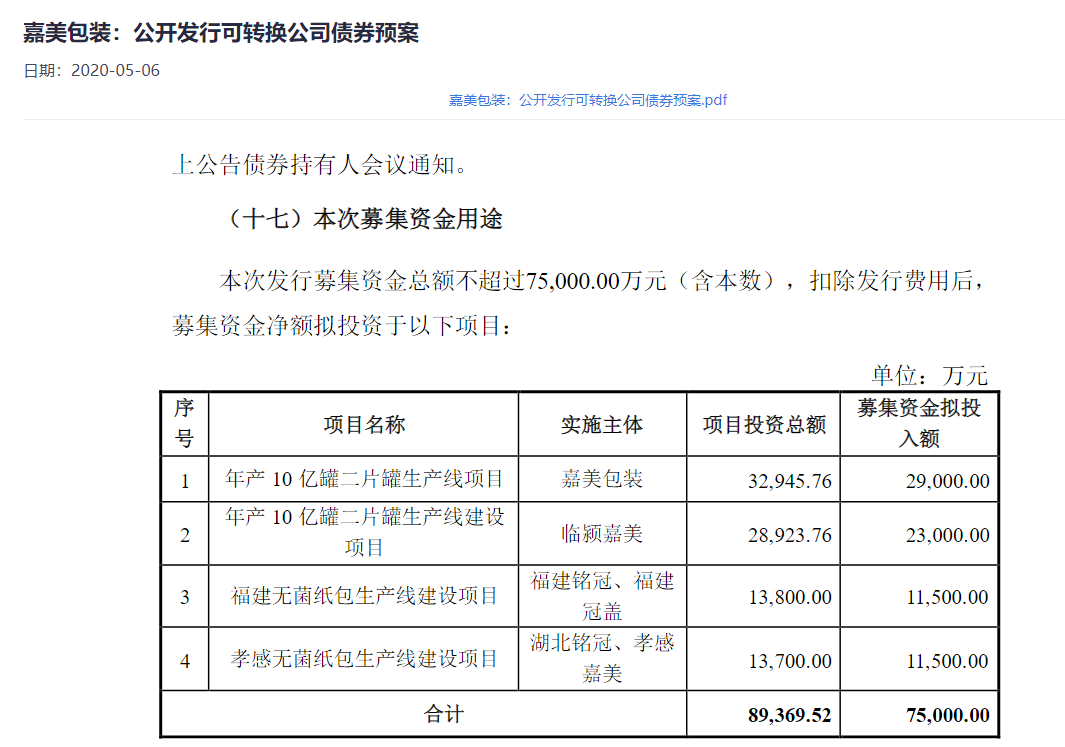嘉美包装发行可转债的募投项目,来源:发行预案