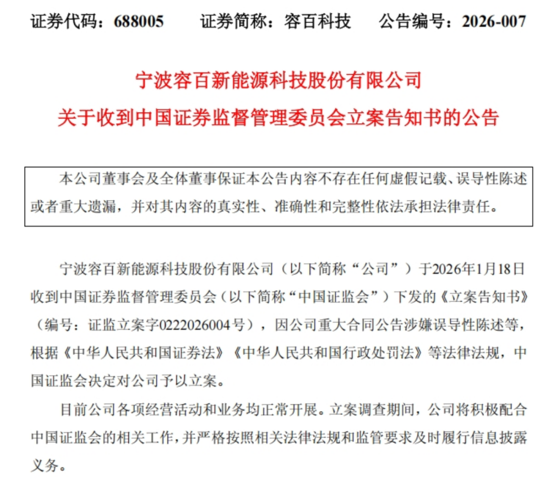 2026年1月14日,容百科技披露日常经营重大合同的公告,涉嫌误导性陈述。近日,证监会已对容百科技立案调查。下一步,将在全面调查的基础上依法处理,切实维护市场健康稳定发展。