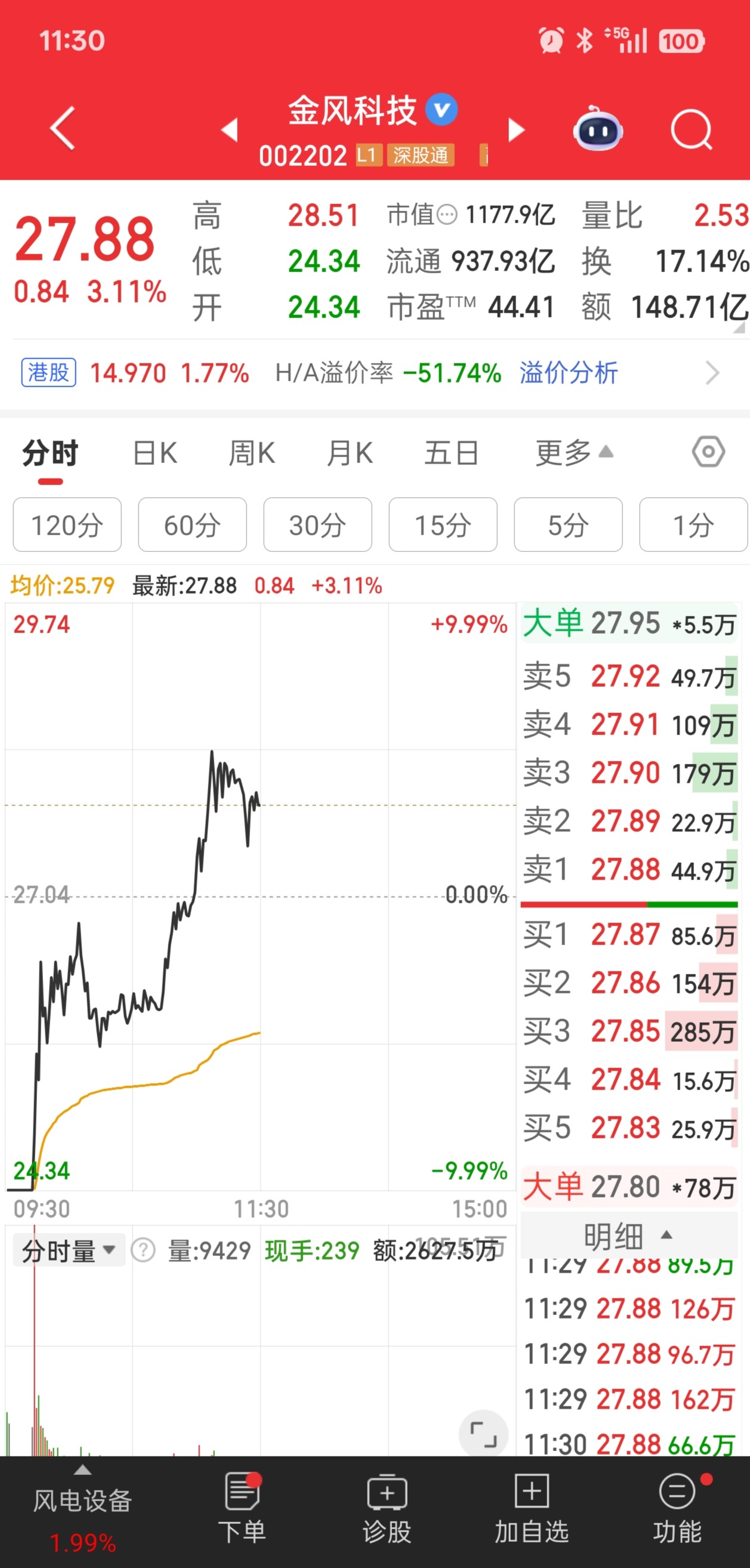 近150亿资金参与抄底 金风科技早盘翻红上涨3.11%