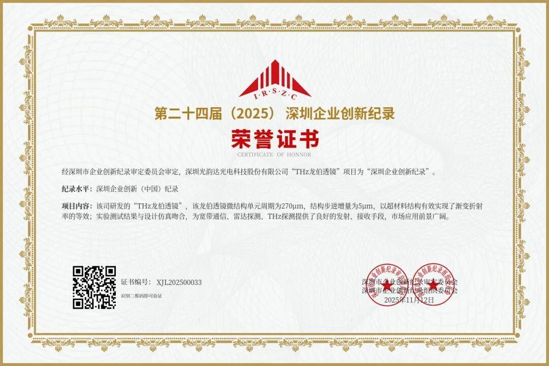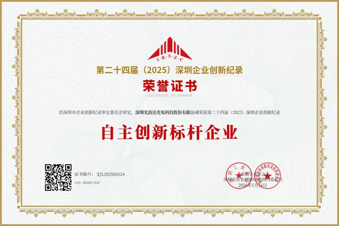 锚定 “十五五” 发展蓝图,扎根粤港澳大湾区创新沃土,“深圳企业创新纪录”审定发布活动创办于2002年,已持续开展二十四届。深圳光韵达光电科技股份有限公司在科技创新驱动高质量发展的时代浪潮中,持续迸发强劲创新活力。