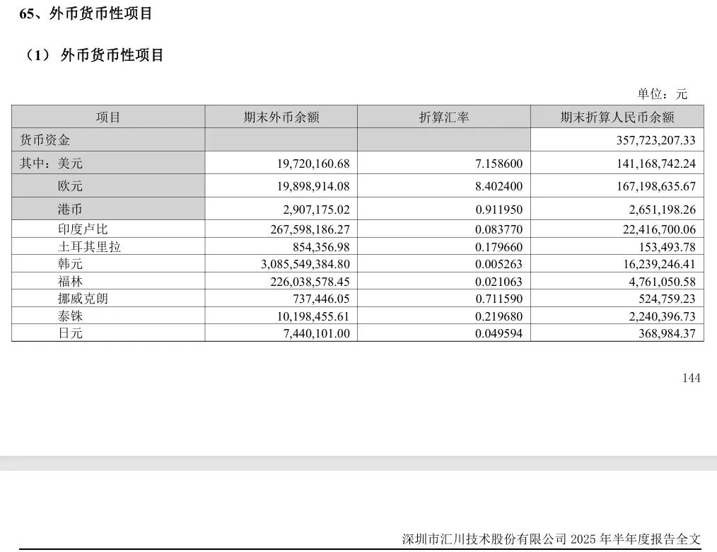 截至2025年6月底,汇川技术外币货币性项目中的货币资金,换算为人民币合计达3.58亿元,其中美元、欧元分别为1972.02万美元、1989.89万欧元,换算为人民币分别为1.41亿元、1.67亿元。