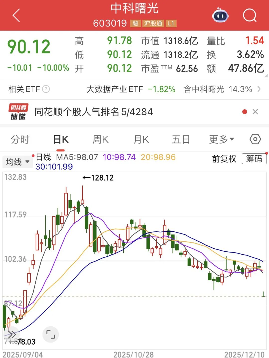 12月10日,在宣布终止与科创板芯片龙头海光信息(688041.SH)的千亿级合并计划后,服务器制造商中科曙光(603019)(603019.SH)开盘即封死一字跌停板,最终以90.12元的价格收盘,总市值应声缩水至1319亿元,单日市值蒸发约146亿元。
