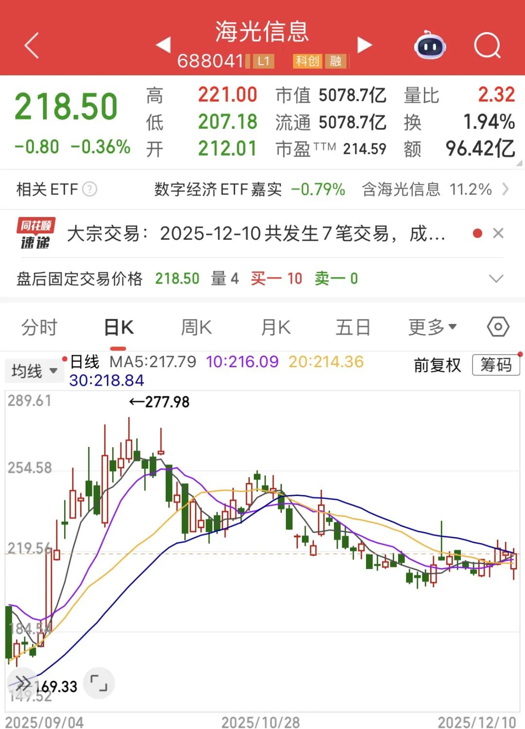 相比之下,本次合并计划的另一方海光信息,当日股价虽一度下探跌超5%,但随后跌幅收窄,最终收报218.5元,总市值依旧站稳5000亿元关口。