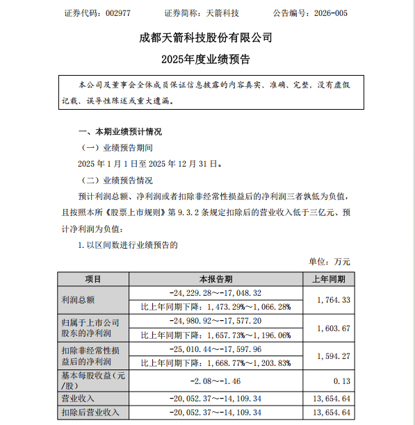 1月19日晚间,天箭科技(002977)发布公告称,基于2025年业绩预告,公司将被实施退市风险警示,股票简称前将被冠以“*ST”字样。
