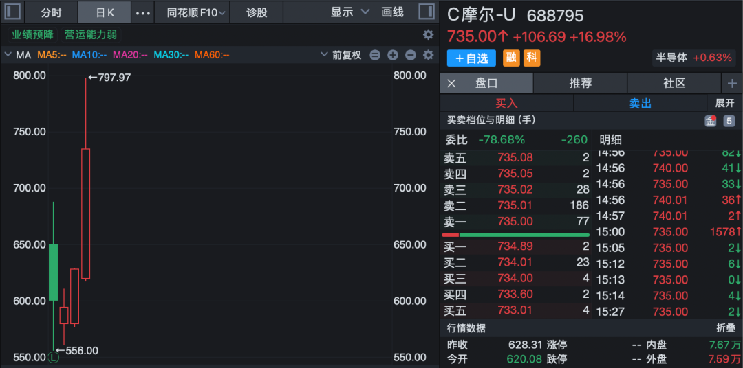摩尔线程12月5日上市后,首日大涨425.46%。12月10日,摩尔线程再度大涨,股价升至735元/股,市值达到3455亿元。