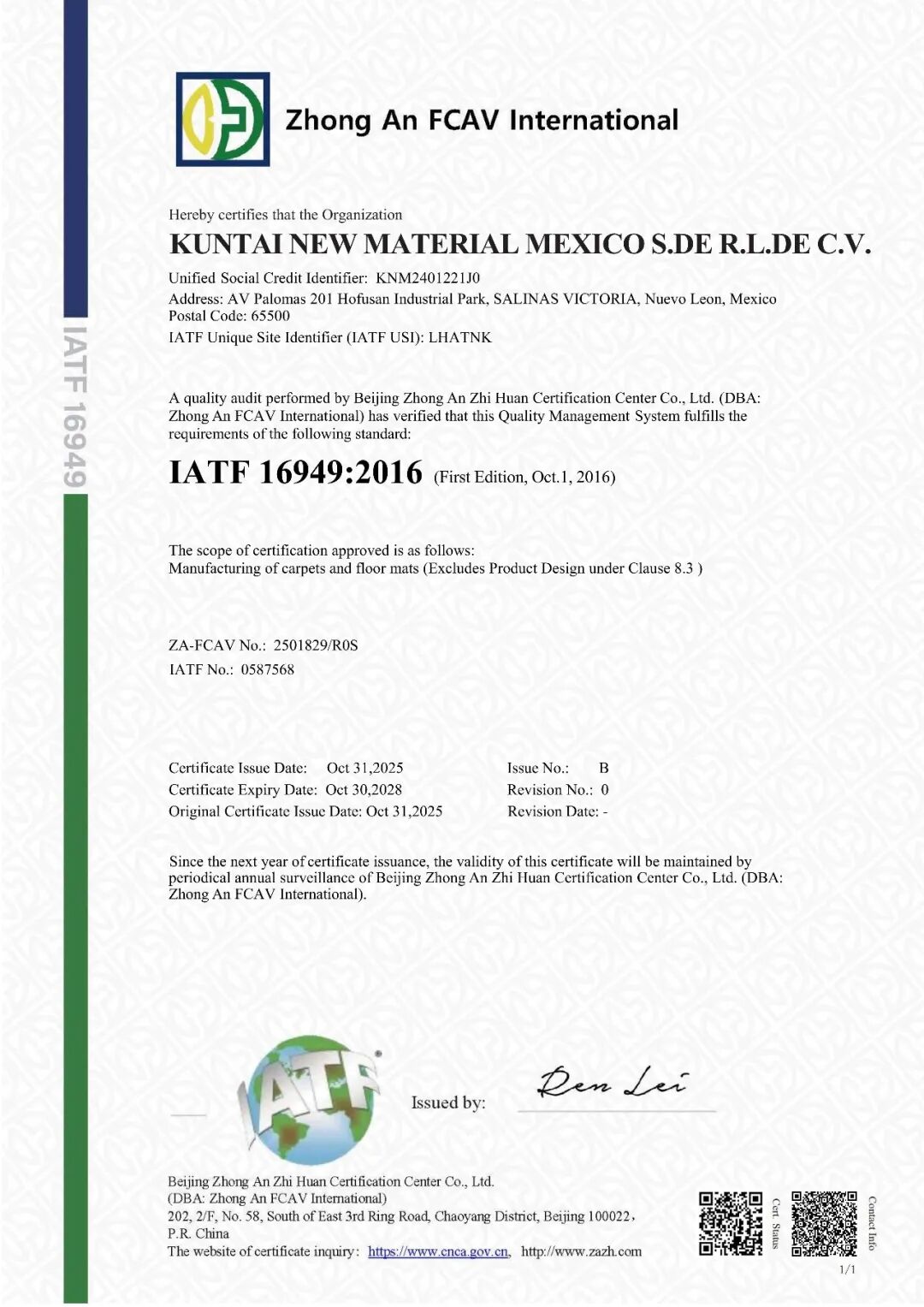 IATF16949并非普通的质量认证,而是国际汽车行业公认的最高标准,专门针对汽车生产件及相关服务件组织。获得该认证,意味着坤泰墨西哥工厂的生产流程、质量控制、供应链管理等全方位能力,均已达到国际主流车企的准入要求。