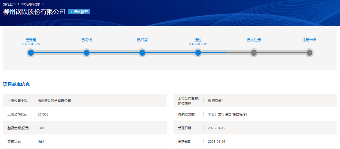 中国经济网北京1月20日讯据上交所网站消息,柳州钢铁股份有限公司(简称“柳钢股份(601003)”,601003.SH)非公开发行股票项目于1月19日审核通过。
