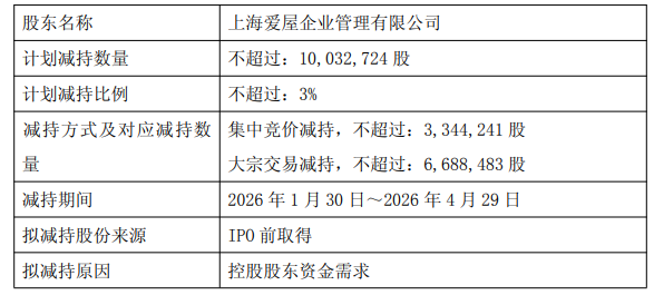 就在2025年预亏公告发布前几天,公司刚刚发布了控股股东上海爱屋企业管理有限公司(以下简称“爱屋企管”)的减持计划。根据公告,爱屋企管拟通过集中竞价交易、大宗交易等方式减持其持有的公司股份合计不超过10,032,724股,即不超过公司总股本的 3%,减持区间为2026年1月30日至2026年4月29日。按公告当时股价粗略计算,减持股份市值超1.4亿元。
