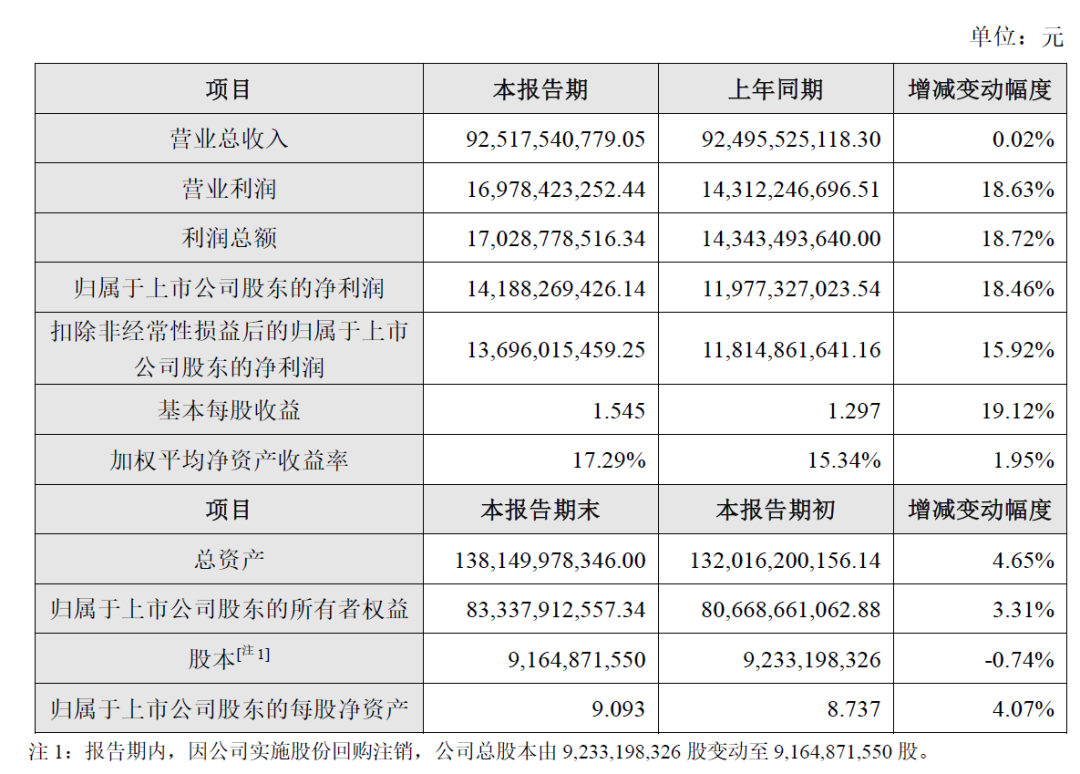 2025年度,公司实现营业总收入92,517,540,779.05元,比上年同期增长0.02%;实现营业利润16,978,423,252.44元,比上年同期增长18.63%;实现利润总额17,028,778,516.34元,比上年同期增长18.72%;实现归属于上市公司股东的净利润14,188,269,426.14元,比上年同期增长18.46%。