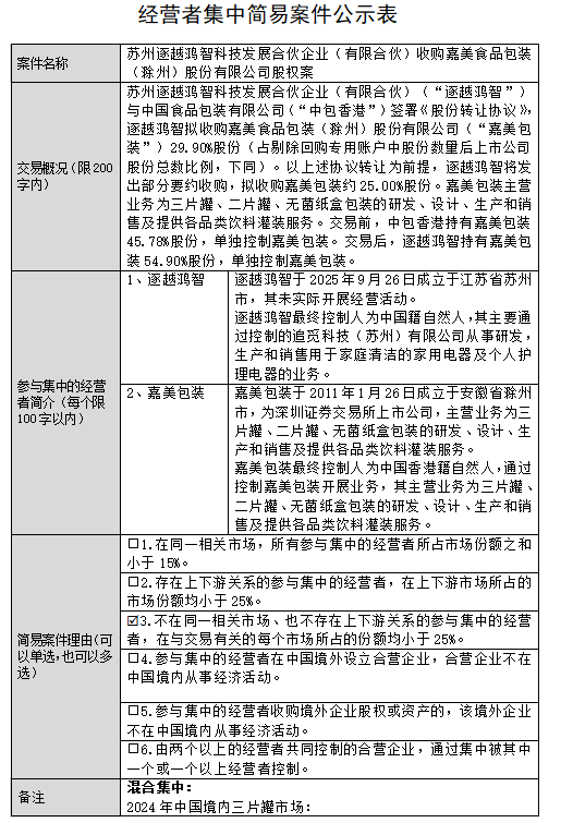 根据经营者集中简易案件公示表,苏州逐越鸿智科技发展合伙企业(有限合伙)(“逐越鸿智”)与中国食品包装有限公司(“中包香港”)签署《股份转让协议》,逐越鸿智拟收购嘉美食品包装(滁州)股份有限公司(“嘉美包装(002969)”)29.90%股份(占剔除回购专用账户中股份数量后上市公司股份总数比例,下同)。以上述协议转让为前提,逐越鸿智将发出部分要约收购,拟收购嘉美包装约25.00%股份。嘉美包装主营业务为三片罐、二片罐、无菌纸盒包装的研发、设计、生产和销售及提供各品类饮料灌装服务。交易前,中包香港持有嘉美包装45.78%股份,单独控制嘉美包装。交易后,逐越鸿智持有嘉美包装54.90%股份,单独控制嘉美包装。