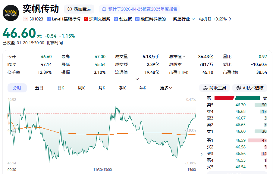 市场上,奕帆传动最新股价报46.6元/股,总市值为36.43亿元。