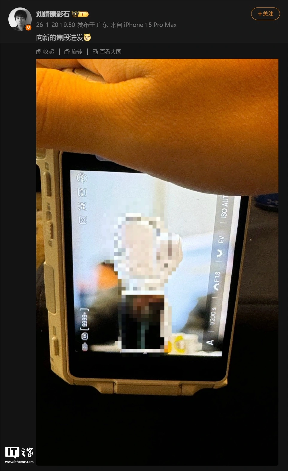 IT之家 1 月 20 日消息,影石创始人刘靖康今晚在微博晒出了一台神秘新机,疑似是相机新品。