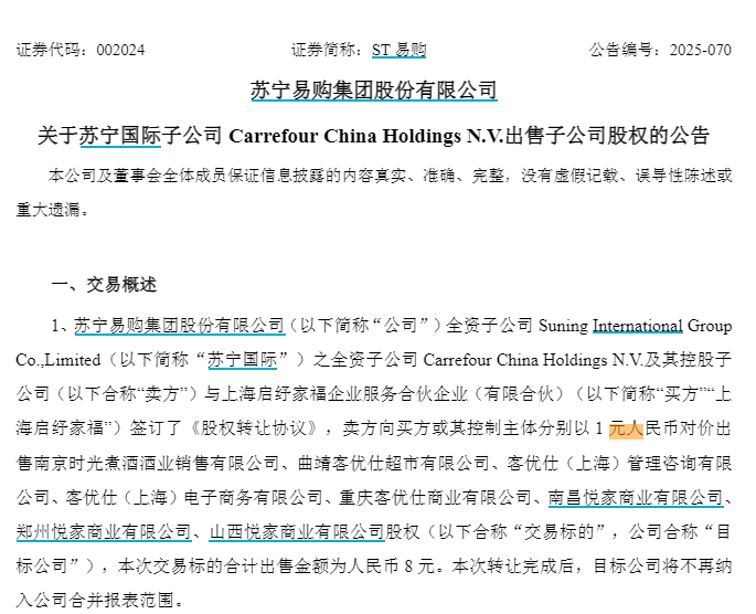 大河财立方消息,12月10日晚间,苏宁易购(002024)发布公告,公司的全资子公司苏宁国际的全资子公司Carrefour China Holdings N.V.及其控股子公司与上海启纾家福企业服务合伙企业签订了《股权转让协议》,分别以1元人民币对价出售南京时光煮酒酒业销售有限公司、曲靖客优仕超市有限公司、客优仕(上海)管理咨询有限公司、客优仕(上海)电子商务有限公司、重庆客优仕商业有限公司、南昌悦家商业有限公司、郑州悦家商业有限公司、山西悦家商业有限公司股权,合计出售金额为8元。