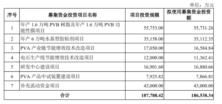 公司本次拟发行不超过28700万股,募集资金拟投向年产1.6万吨PVB树脂及年产1.6万吨PVB功能性膜项目、年产6万吨水基型胶粘剂项目、PVA 产业链节能增效技术改造项目、电石生产线节能增效技术改造项目、研发中心建设项目、PVA产品中试装置建设项目以及补充流动资金。