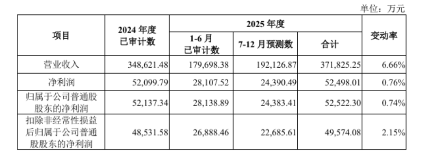 公司预测2025年度实现营业收入37.19亿元,较上年增长6.66%;2025年归母净利润为5.25亿元,较上年增长0.74%。