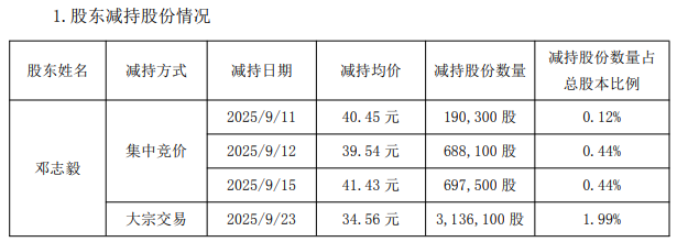 近日,公司收到邓志毅出具的告知函,获悉其于2025年9月15日至2025年9月23日期间通过集中竞价、大宗交易方式累计减持公司股份3,833,600股,占公司总股本的2.43%,权益变动触及1%整数倍。截至公告披露日,邓志毅的股份减持计划已实施完毕。