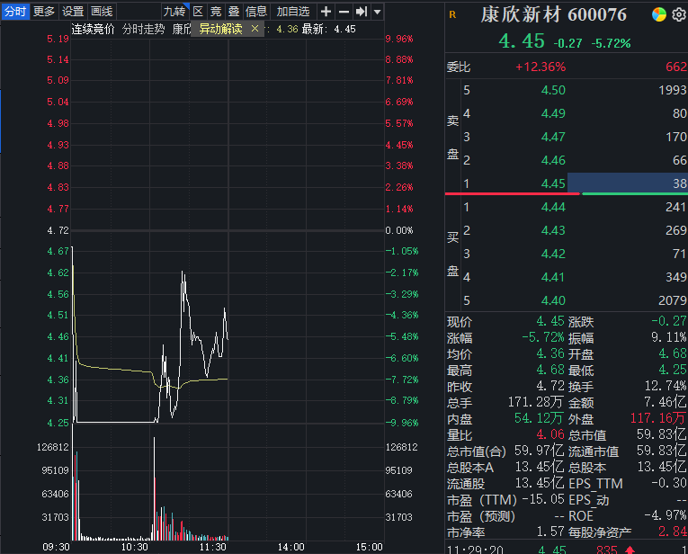康欣新材(600076)的投资者不会想到,跨界半导体的消息却换来公司股价跌停。1月21日早盘,康欣新材股价低开后直线下坠,火速触及跌停,其间短暂撬起后很快又封死跌停,封单金额一度超过1亿元。10时30分后,该股股价再度撬起,截至上午收盘,报4.45元/股,跌5.72%。