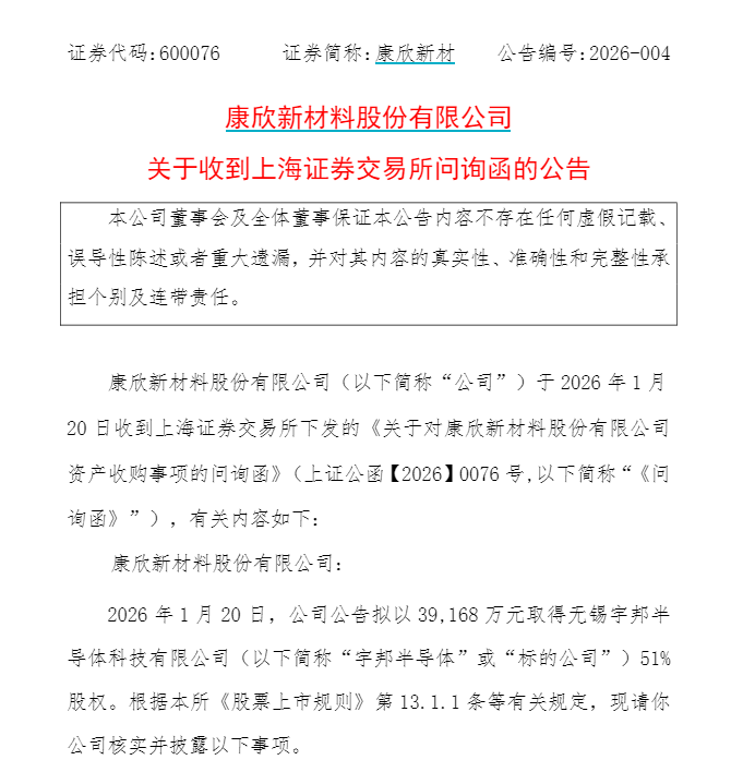 上交所一连抛出五问,分别涉及交易合理性、标的公司业务可持续性、标的公司业绩承诺和财务情况、标的公司估值情况和内幕信息管理等问题。交易所指出,主业持续亏损的康欣新材需要对公司是否具备交易资金支付能力、收购宇邦半导体股权的合理性以及交易信息是否提前泄露作出充分解答。