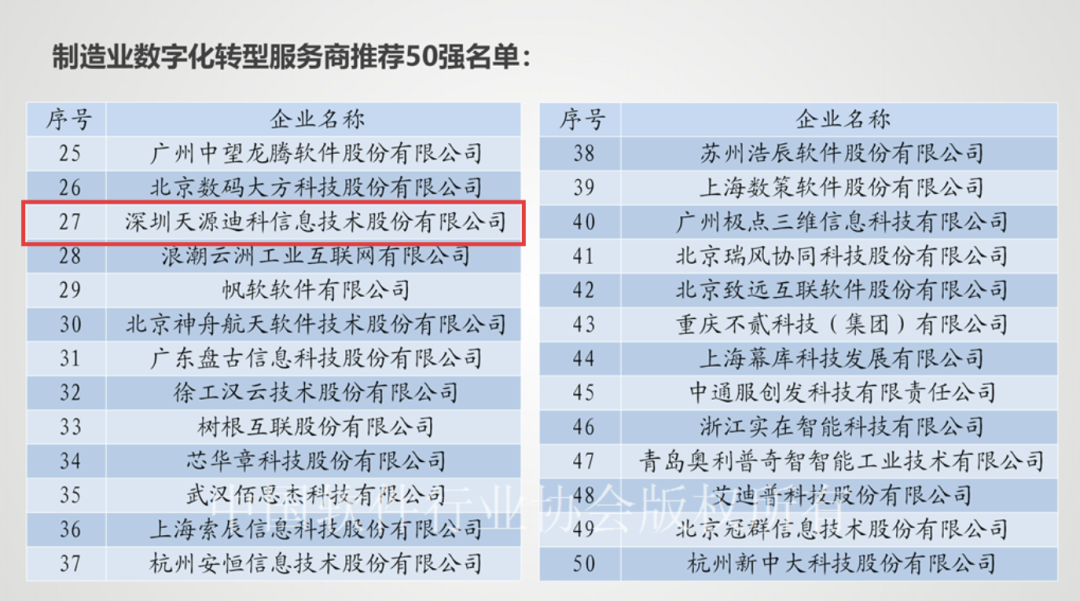 天源迪科入选“制造业数字化转型服务商推荐50强”