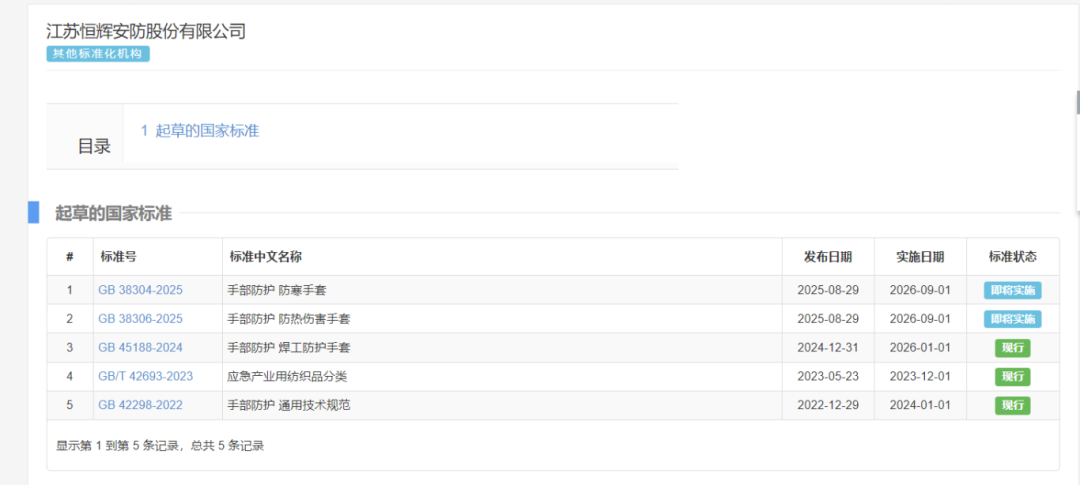 随着《防寒手套》国标的发布,恒辉安防已完成五项国家标准的制定工作,覆盖手部防护的核心场景与通用规范,展现出系统化的标准构建能力: