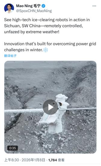 2026年新年伊始,四川凉山3300米高原的风雪中,一台被网友亲切称为“小黄人”的智能机器人正沿着输电线路匀速行进,所过之处冰雪尽数消融——这正是信通电子(001388)自主研发的新一代具身智能线路防冰机器人的作业视频。该视频不仅刷屏海内外社交平台,更获外交部发言人点赞,新华社、人民日报等权威媒体纷纷转载报道,成为“人工智能+机器人”赋能电力领域的“中国智造”标杆。