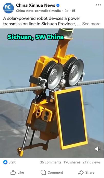 1月21日,中央4台《中国新闻》栏目,聚焦雨雪冰冻天气下的民生保障工作,报道了国网湖北省电力有限公司启用防冰机器人开展输电线路除冰保障的场景:整个作业过程无需人工介入,在50公里外的指挥中心远程指令下即可自主完成。该防冰机器人也是由信通电子研发完成。