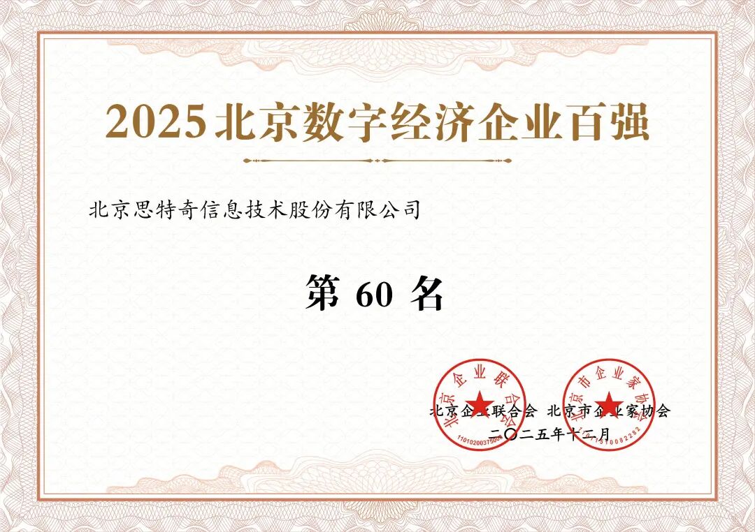 此次荣登三大百强榜单,是对公司发展成果的高度认可,更是对未来发展的激励。面向“十五五”数字化蓝图,立足人工智能和数据要素浪潮之中,思特奇将继续秉承服务行业、科技报国的初心,深刻把握科技创新与产业升级的时代机遇,以端到端AI原生能力体系为核心引擎,构筑领先数智底座,助力千行百业智慧升级,为推动首都及国家数字经济发展发展、培育新质生产力贡献思特奇力量。