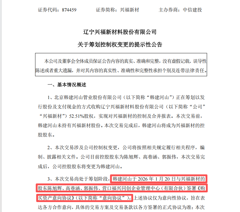 兴福新材、韩建河山均公告称,1月20日,韩建河山与本次交易的主要交易对方陈旭辉、高巷涵、郭振伟,以及营口福兴同创企业管理中心(有限合伙)(以下简称福兴同创)签署《购买资产意向协议》。