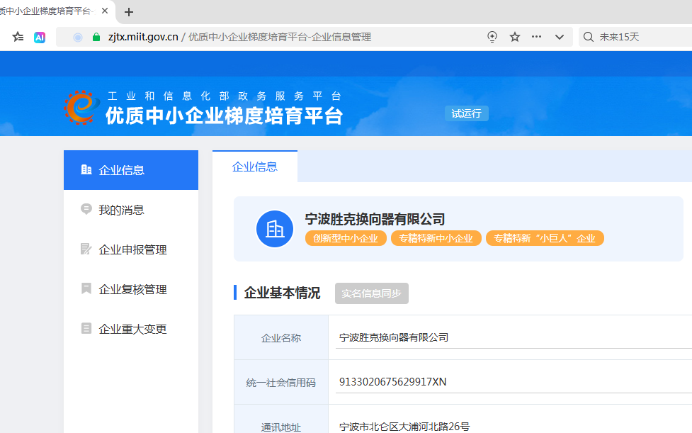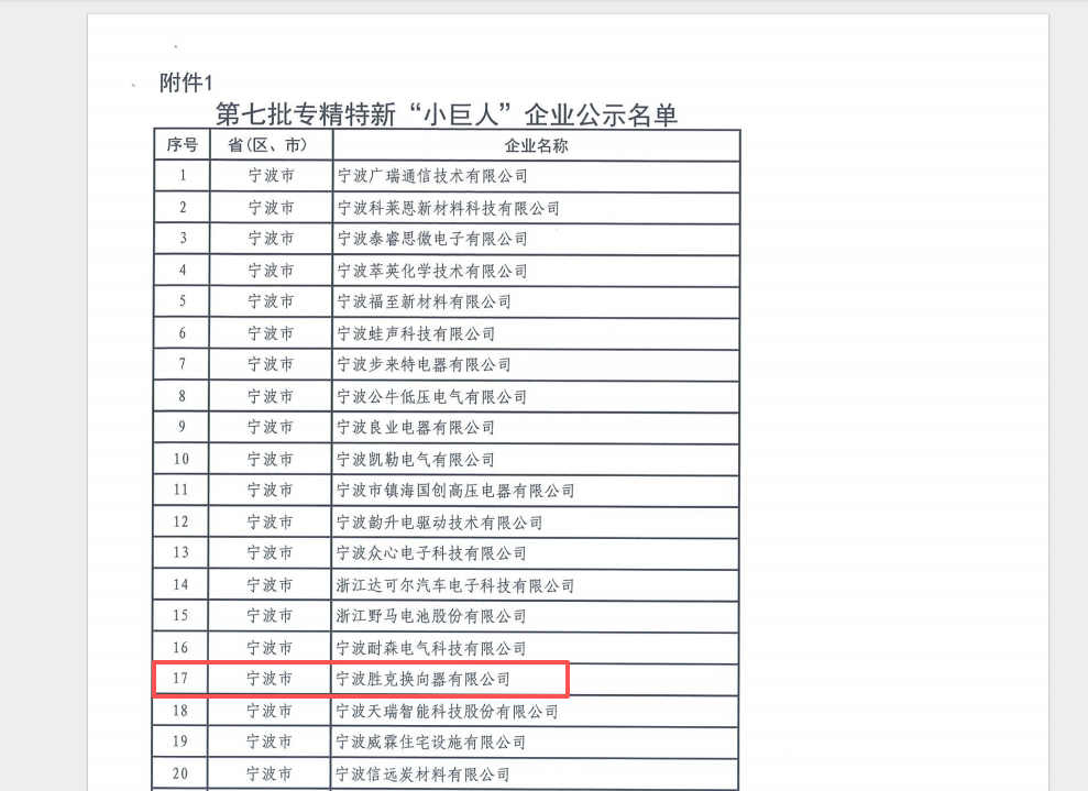 喜讯!宁波胜克换向器有限公司成功获评国家级专精特新“小巨人”企业