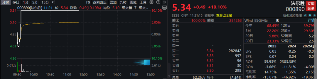 11日早盘,法尔胜(000890)上演极致拉升。其股价低开下探后迅速掉头向上,盘中出现一根强势拉升的直线,一气呵成冲至涨停板。截至发稿,该股股价仍封死涨停,报5.34元/股,创下年内新高,成交额超过2亿元。