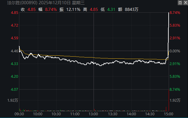 值得一提的是,这已是该股连续第二日出现异常拉升。昨日尾盘集合竞价阶段,法尔胜遭资金“突袭”,在一分钟内股价直线飙涨由绿翻红,最终收涨8.74%,全天振幅为12.11%。
