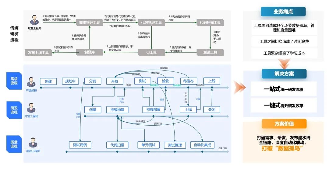 拉通从需求、设计、开发到测试、交付的全链路,建立敏捷透明的协同机制
