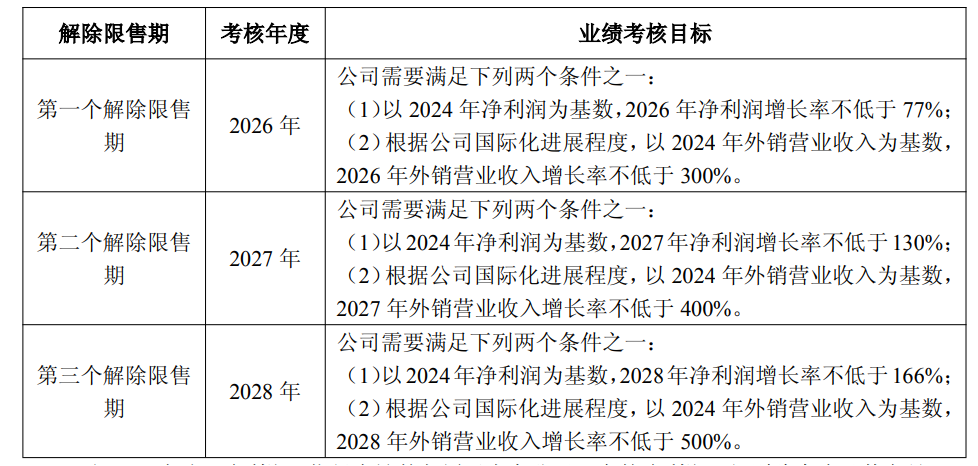 业绩考核目标方面,此次激励计划聚焦盈利能力和全球化战略,分三期解除限售,比例分别为40%、30%、30%,自授予日起满12个月后启动。公司层面解锁条件为2026年净利润增长较2024年不低于77%,或外销收入较2024年增长不低于300%;2027年净利润较2024年增长不低于130%,或外销收入较2024年增长不低于400%;2028年净利润较2024年增长不低于166%,或外销收入较2024年增长不低于500%,指标以剔除股份支付费用后的净利润及年度报告披露的外销数据为准。此外,股权激励还设置了个人层面绩效考核要求。