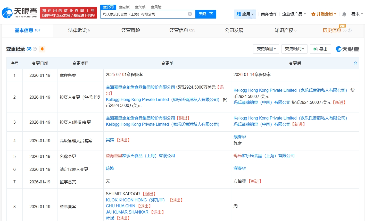天眼查工商信息显示,近日,益海嘉里家乐氏食品(上海)有限公司发生工商变更,企业名称变更为玛氏家乐氏食品(上海)有限公司,原股东金龙鱼退出,新增玛氏箭牌糖果(中国)有限公司为股东,陈波卸任法定代表人,由濮春华接任,同时,多位主要人员发生变更。