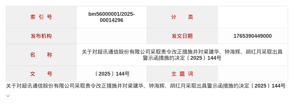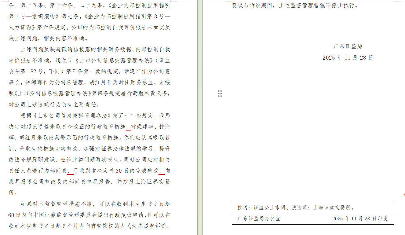 蓝鲸新闻12月11日讯,近日,广东证监局发布了行政监管措施决定书,剑指超讯通信(603322)股份有限公司及梁建华、钟海辉、胡红月。