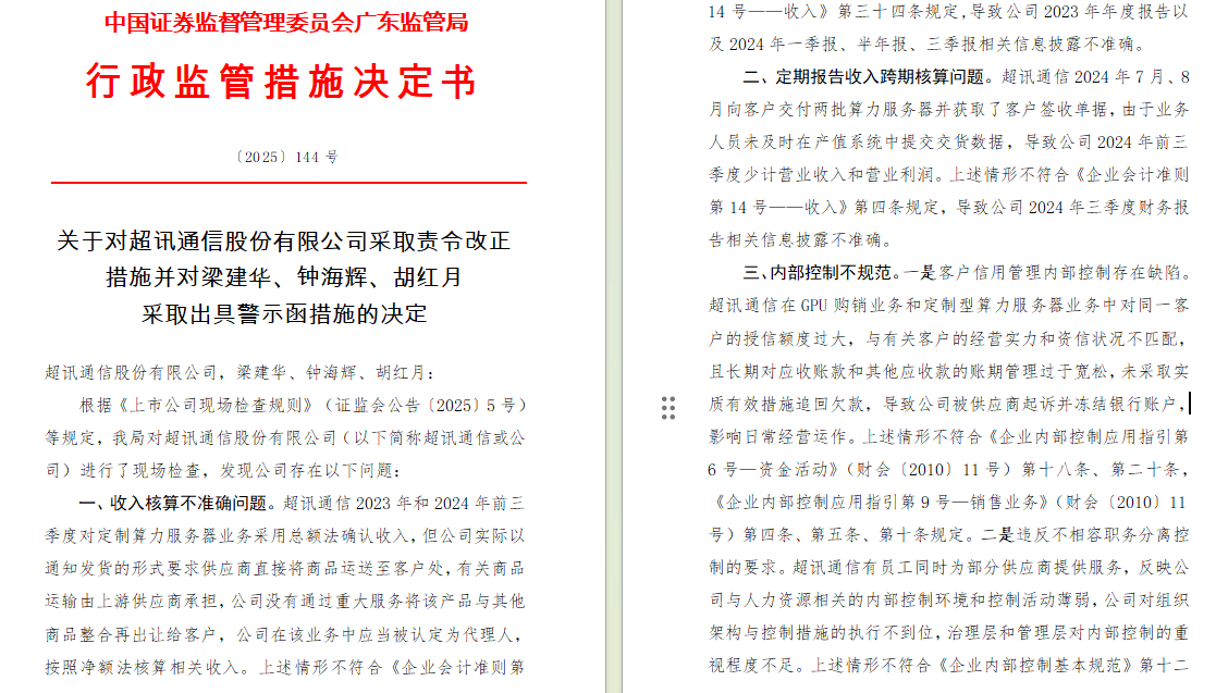 针对以上问题,广东证监局决定对超讯通信采取责令改正的行政监管措施,对梁建华、钟海辉、胡红月采取出具警示函的行政监管措施。