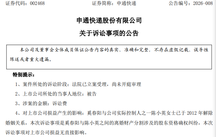 针对此次诉讼,申通快递在公告中作出明确表态,涉诉股份占公司总股本的1.33%,该事项不会对公司正常生产经营、内部治理和规范运作产生重大不利影响,也不会改变公司的实际控制权。同时公司指出,诉讼目前仅处于立案受理阶段,尚未开庭审理,陈小英名下股份是否发生权益变动仍存不确定性。