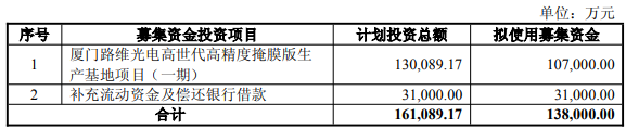 路维光电首次公开发行募集资金总额83,600.67万元,扣除发行费用后,募集资金净额为76,051.05万元。路维光电实际募资净额比原拟募资多35,545.79万元。路维光电2022年8月12日披露的招股书显示,公司原拟募资40,505.26万元,拟用于“高精度半导体掩膜版与大尺寸平板显示掩膜版扩产项目”、“路维光电研发中心建设项目”、“补充流动资金”。